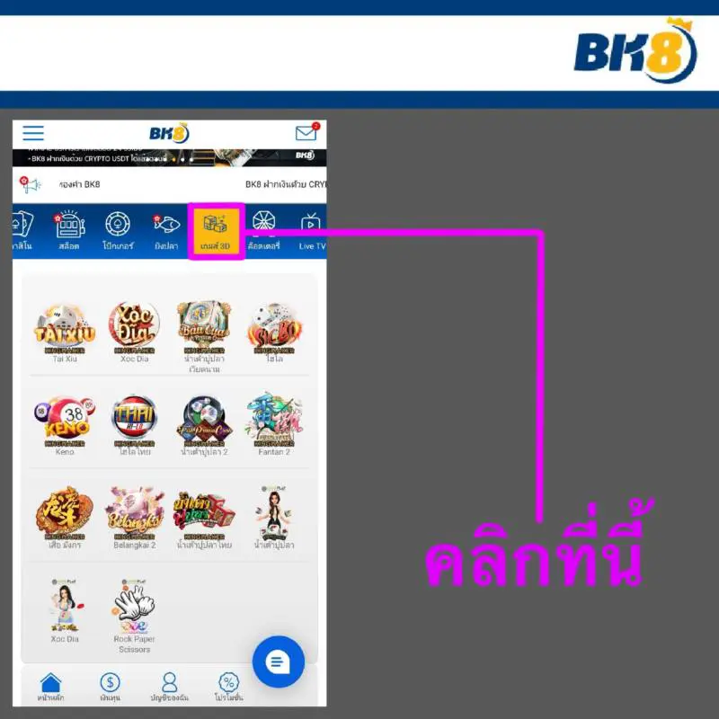1. หลังจากที่ลูกค้าสมัครสมาชิกและทำธุรกรรมต่างๆเสร็จสิ้นหมดแล้วให้เข้ามาที่หน้าหลักของ bk8 แล้วกดไปที่ “เกมส์3D” ในหน้านี้จะมีเกมส์ให้เลือกเล่นมากมายเช่น ไอโล น้ำเต้าปูปลา เป่ายิ้งฉุบและอื่นๆตัวอย่างดังภาพ